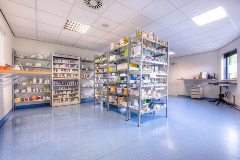 In deze ruimte worden de medicijnen na binnenkomst uitgepakt, ingeschreven en gecontroleerd op batch-nummers en vervaldata. Vervolgens worden de medicijnen op de plank geplaatst om uiteindelijk op recept van de dierenarts te worden uitgeleverd.